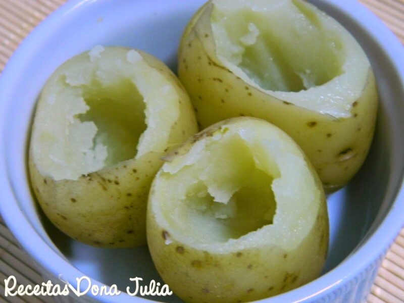 Corte a pontinha das batatas e tire um pouco da poupa para colocar o recheio. (Não jogue a poupa fora, utilize para fazer um PURÊ DE BATATA)