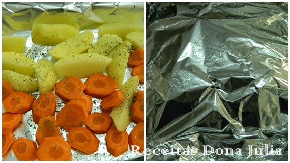 Coloque uma folha de papel alumínio, regue com um pouco de azeite, coloque as batatas e as cenouras, sal e orégano a gosto.