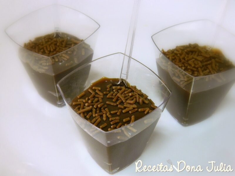 Misture bem e leve ao fogo baixo, mexendo sempre, até começar a desgrudar da panela, desligue o fogo. Espere esfriar, coloque os copinhos e decore a gosto, com granulados ou confeitos, brigadeiro no copinho dão um charme a mais a mesa da sua festa.
