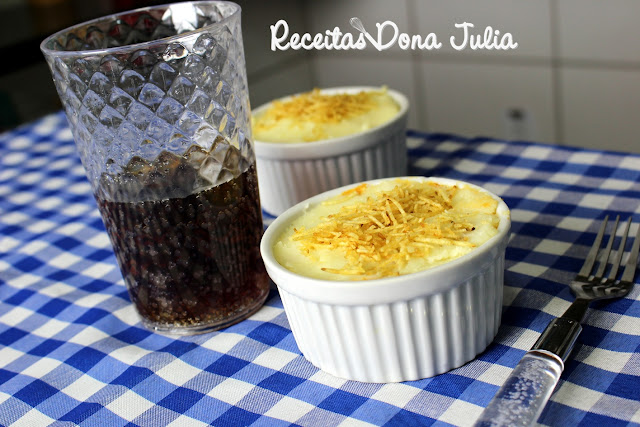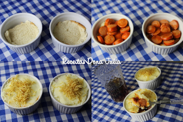Para fazer é super simples, coloque uma fatia de pão de forma sem casca no fundo do potinho, cobre com salsicha feita em molho (corte a salsicha em rodelas, coloque azeite, alho e cebola em uma panela e refogue, acrescente 2 tomates picadinhos, a salsicha cortada, tempere a gosto com sal e pimenta e acrescente um sache de molho de tomate) por cima da salsicha coloque purê de batata (veja uma receita de purê  de batata AQUI) e batata palha, se quiser pode acrescentar requeijão cremoso e queijo a gosto. Leve ao forno para dar uma leve dourada. Sirva.