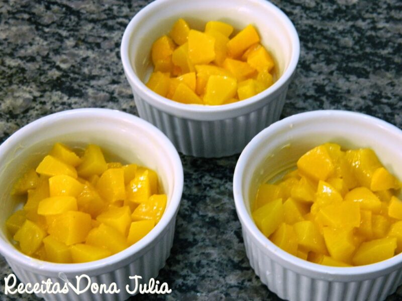 Corte os pêssegos em cubos e coloque em refratário untado com margarina. Reserve.