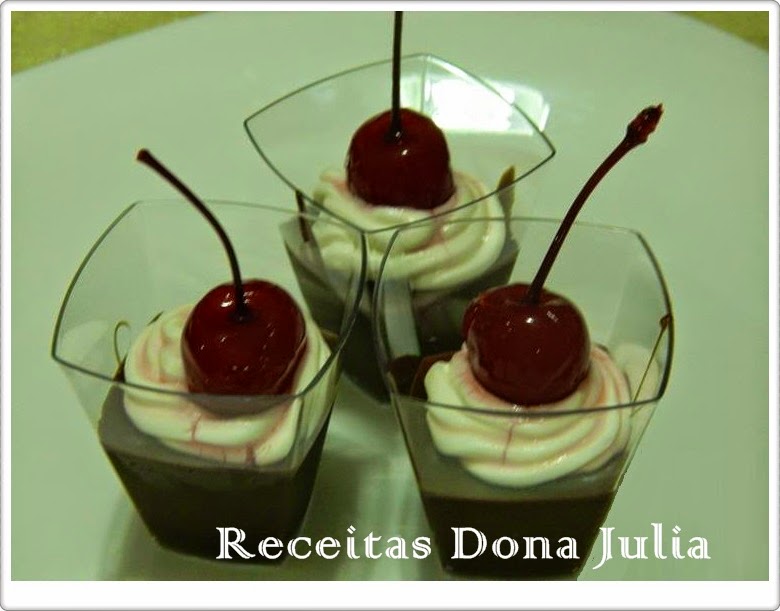 Coloque nos copinhos uma camada de ganache e chantilly, use confeitos ou cerejas para decorar.