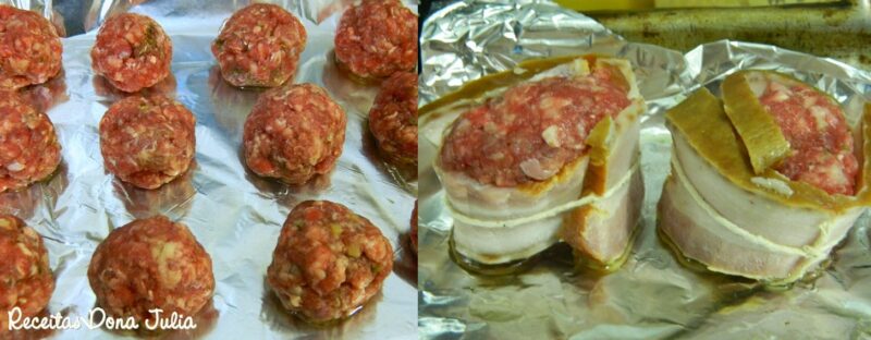 Em um recipiente, misture as carnes, o alho, o pão umedecido em um pouco de água ou leite (eu usei água), a cebola. Molde as almôndegas, enrole em uma fatia de bacon e prenda com palito de dente ou amarre com um pedaço de barbante. Coloque em forma com uma folha de papel alumínio pra não grudar, e leve ao forno pré aquecido 180º até dourar.
