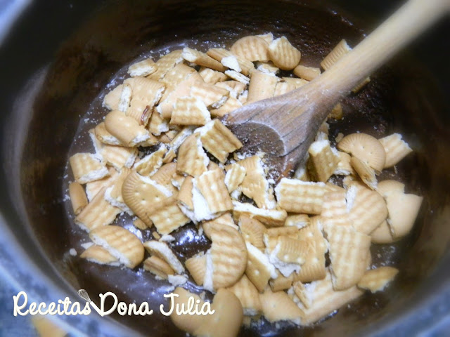 Já com o fogo desligado jogue o pacote de biscoito de maisena em pedaços e
