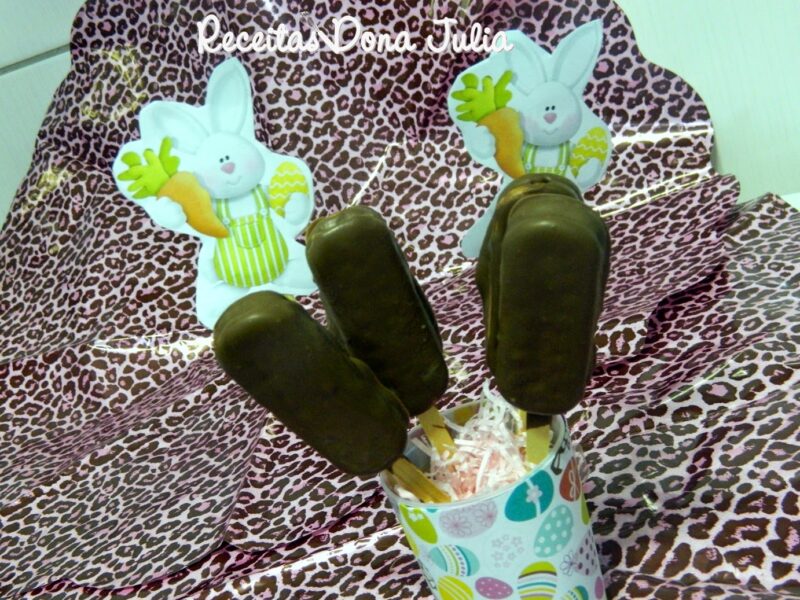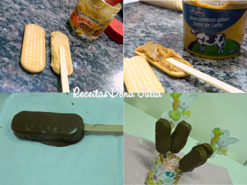 Passe o recheio de sua preferencia em um biscoito coloque o palito de sorvete e feche com o outro biscoito, formando assim o pirulito, passe no chocolate derretido e coloque em uma bandeja forrada com papel manteiga ou espete de pé em algum local para deixar o pirulito secar. Antes de secar o chocolate você pode por vários confeitos, granulados. Depois você pode embalar com um saquinho e um lacinho. Fica super gostoso e bonito para enfeitar sua mesa de Pascoa!